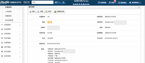 目前我校接入RG-BDS大数据安全分析平台的数据包括了服务器、网路设备、安全设备等44台,平均每天的日志量在1.8亿左右,开启的基于规则类和基于经验学习类分析模型有35个。