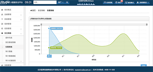 网络攻击行为异常的分析逻辑是基于经验学习,收集全网攻击日志至少4个周,绘制经验曲线并与实时曲线匹配,当超过300%阈值(可调)时触发告警1次,并不断追加统计。