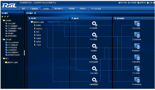 在项目中采用的IT运维系统,从医院信息中心的视角出发,面向全院IT业务实现“一站化”全局管理。RIIL将医院核心网络环境、基础IT资源、应用性能实现了有效量化,清晰呈现医院IT建设的投资分布,直观反映基础设施的动态变化对业务造成的影响和潜在威胁,全面保障了临床业务的稳定运行。