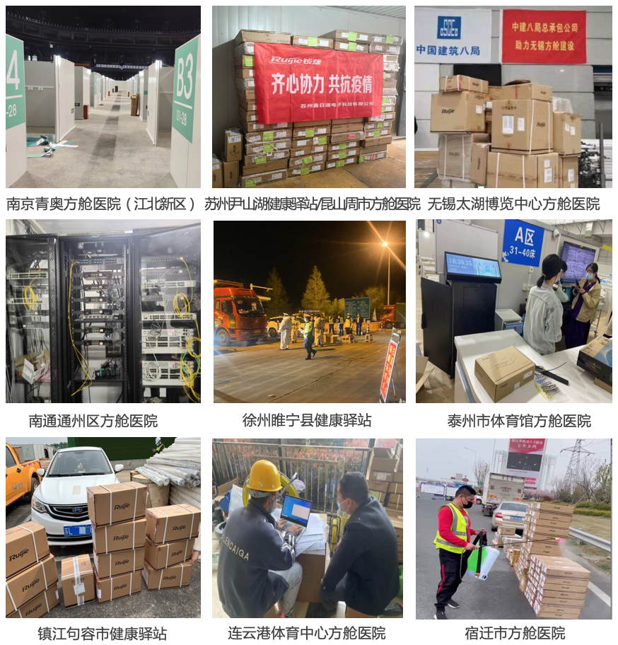 尊龙时凯团队从2月起陆续接到建设任务,支持了南京青奥方舱医院(江北新区)、苏州市尹山湖健康驿站、苏州昆山周市方舱医院、无锡太湖博览中心方舱医院、南通通州区方舱医院、徐州睢宁县健康驿站、泰州市体育馆方舱医院、镇江句容市健康驿站、连云港体育中心方舱医院、宿迁市方舱医院10个项目的建设,累计派出数十名尊龙时凯人深入一线,与建设单位并肩作战,日以继夜的投入在现场地勘、项目规划、设备配置、资源协调、安装调试等服务保障工作中,累计为十个项目提供了包含交换、路由、网关、无线、云桌面、安全等产品在内的数千台设备与服务。