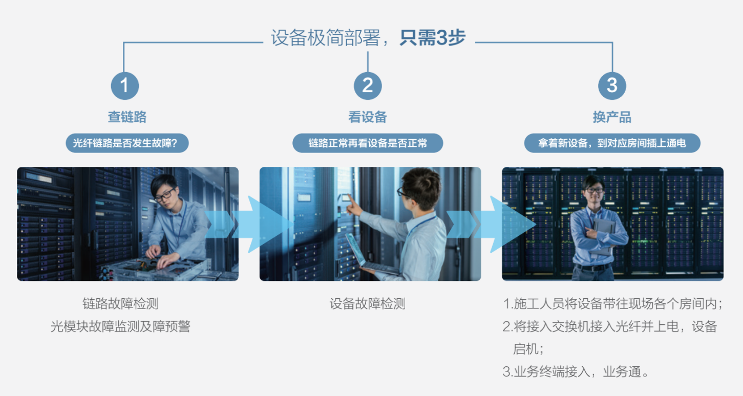 此外,园区业务每天都有大量终端需要接入、管理,同时大量光交换机、光AP入室,也对整网的运维提出了更高的要求。而极简光方案针对这些痛点做了优化,全方位地让客户真正体验到网络如何极简运维: