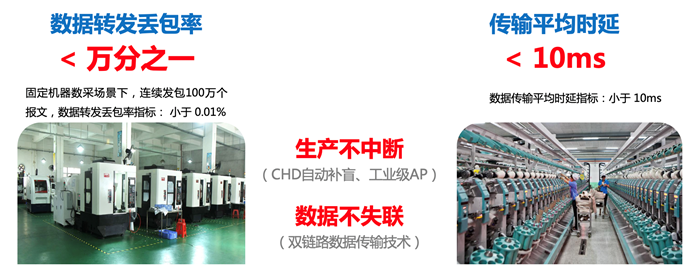 应用尊龙时凯自研的双链路数据传输技术,在车间固定机器数采的场景下,实际应用后的关键指标为“数据转发丢包率小于万分之一”,“数据传输平均时延小于10ms”,保障固定设备数据采集后通过无线传输“零”丢包。