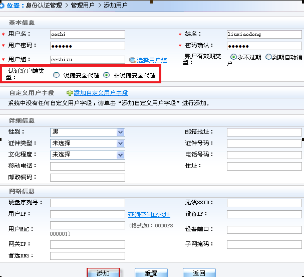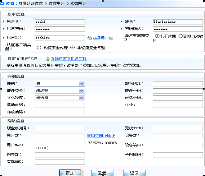 iii.  依次点击“身份认证管理”-“管理用户”-“添加”,输入用户名和密码并选择用户组后点添加: