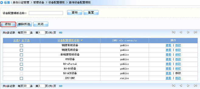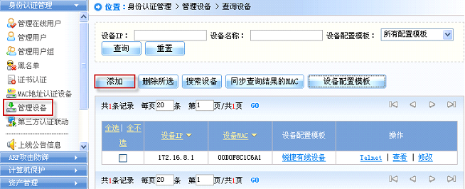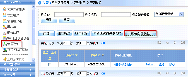 3) 在“管理设备”中配置“设备配置模板”并添加认证设备;