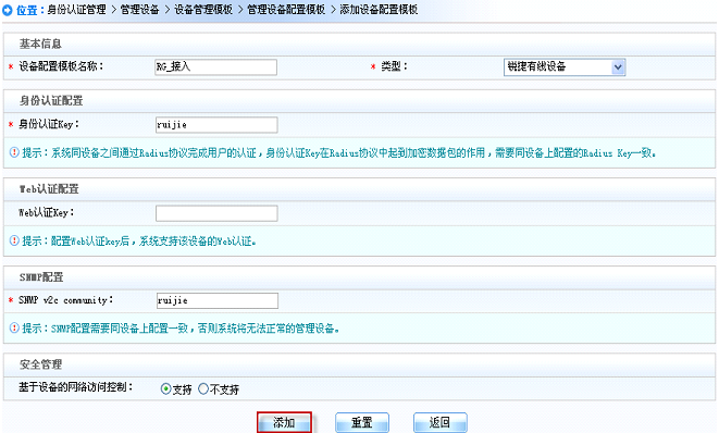 ii.输入“设备配置模板名称”,选择设备类型(SMP支持多种设备类型,添加时务必确认当前使用的设备类型并正确选择),输入“身份认证key”,填写“SNMP v2c community”配置,注:“身份认证key”和“SNMP v2c community”配置需和交换机配置的参数一致;