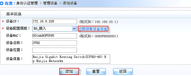 iv. 添入正确的设备IP,选择刚添加的“设备配置模板”后点击“立即获取设备信息”(设备需配置SNMP并和SMP设备模板中的配置一致),点击添加完成设备添加: