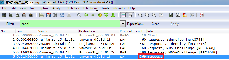 1) 第一部分是客户端和接入交换机之间交互EAP报文,正确的EAP报文交互过程如下:(本例使用抓包工具为wireshark)