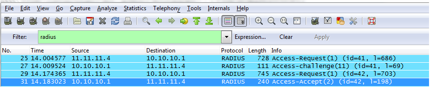 2)第二部分是接入交换机和SMP之间交互radius报文,正确的radius报文交互过程如下:(本例使用抓包工具为wireshark)