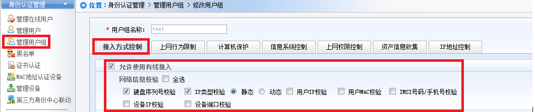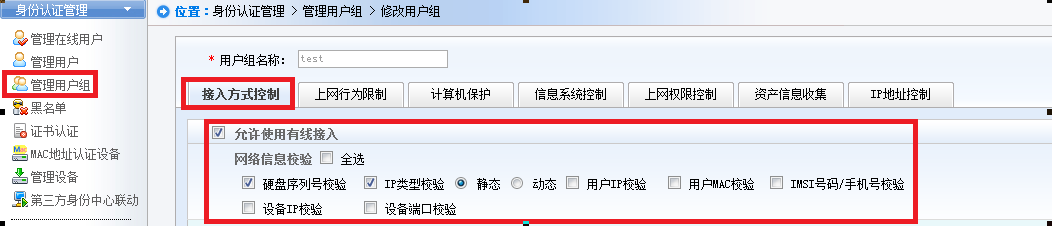 i.  进入SMP管理界面,依次打开“身份认证管理”-“管理用户组”,找到认证失败用户所在的用户组点击修改,在接入方式控制标签取消掉“网络信息校验”中的相关校验内容;