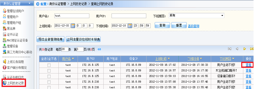 2)在SMP管理界面,依次打开“身份认证管理”-“上网历史记录”搜索认证失败用户的上网历史记录点击查看,如图所示: