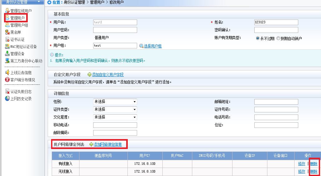 4)如果用户需要修改当前绑定的网络信息,在SMP管理界面,依次打开“身份认证管理”-“管理用户”找到需要修改绑定信息的用户,手动删除当前的绑定信息;