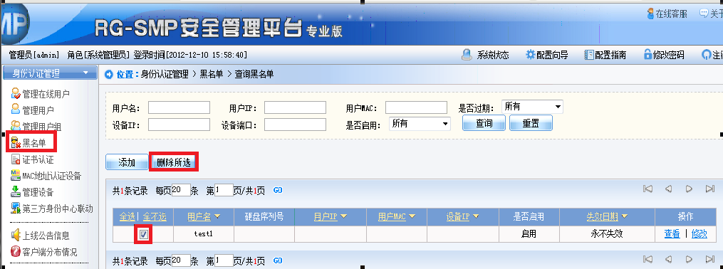 1) 在SMP管理界面依次进入“身份认证管理”-“黑名单中”,查看用户是否在黑名单中,如需解除用户的黑名单状态,只需在黑名单选中并删除用户记录即可,如图所示:;