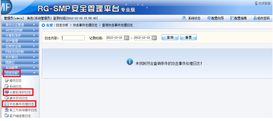 2)确认后,如果不是管理员手动将用户加入黑名单,可以在SMP的“日至分析”-“计算机保护日志”或“攻击事件处理日志中”查找用户被加入黑名单的原因: