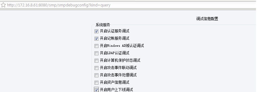 1). 请在浏览器输入:http://1.1.1.1:8080/smp/debugtool.jsp(将1.1.1.1替换为SMP真实IP),并勾选“开启认证服务调试“、“开启记账服务调试”、“开启用户上下线调试”三个开关后,点击最下方的“修改”按钮,开启debug调试开关。