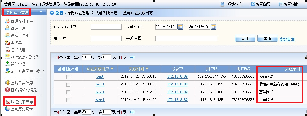 当客户端提示认证失败时,首先查看SMP中的认证失败原因,如下图所示:
