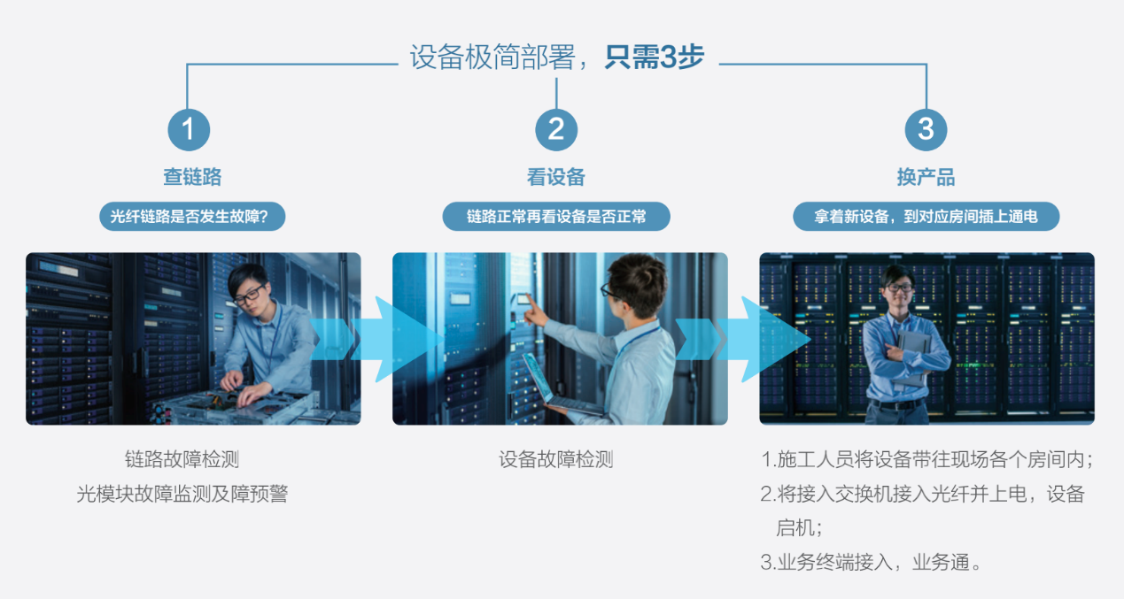 “换设备,有极简光的零配置上线功能,新的光交换机只需要插上电、接入光纤和网线,启动开机,设备就自动上线了,全流程一气呵成费时不到一分钟,即便你完全不懂网络,也可以完成设备替换。”