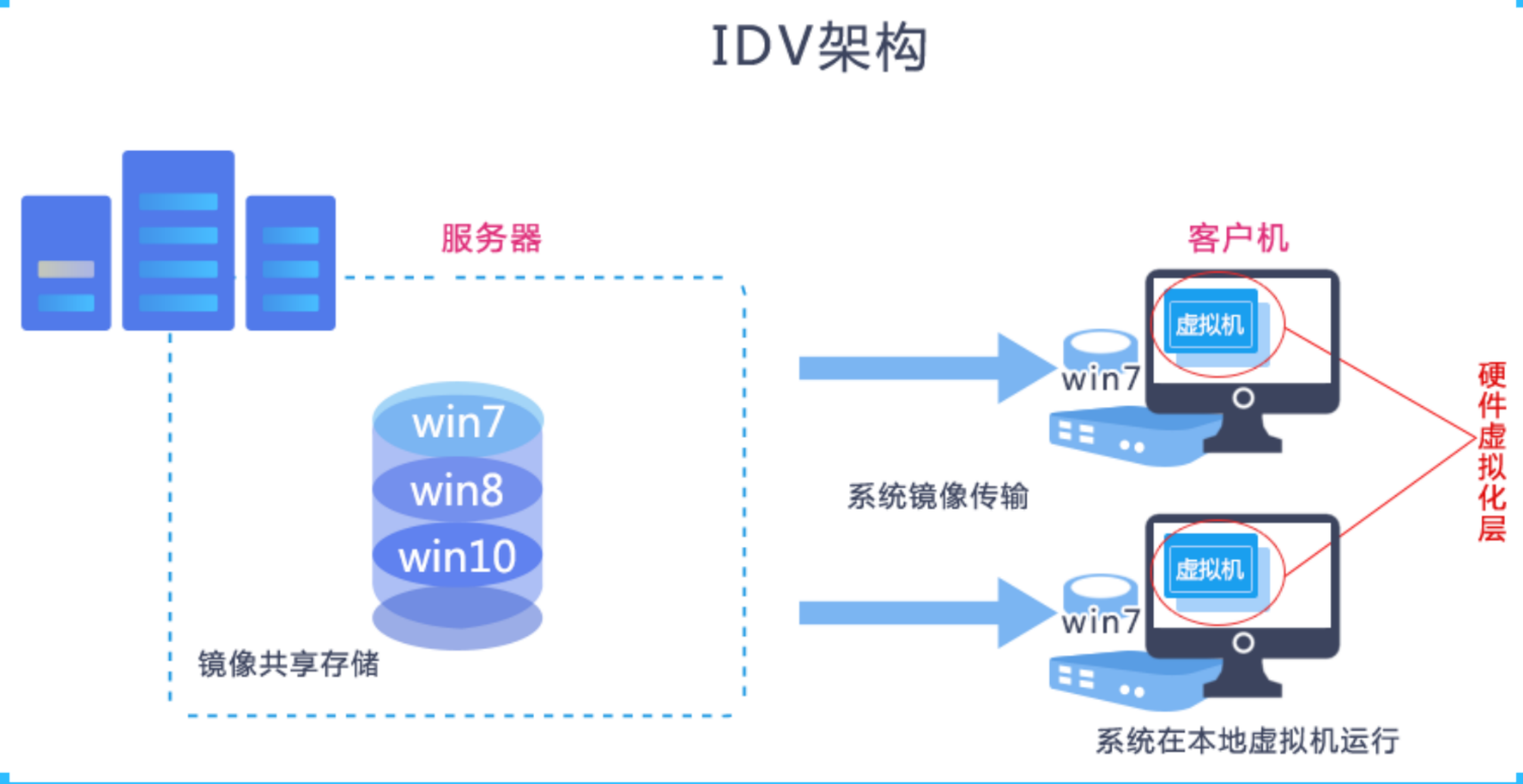针对VDI的先天缺陷,Intel提出了IDV概念----智能桌面虚拟化,采用集中存储、分布运算的构架。IDV的数据存储集中在后端,镜像存储在本地,配置并下发到终端机器硬盘上,终端通过虚拟机运行桌面,因此离线是可用的。IDV 不再对网络过度依赖,无需大量的图像传输,支持系统离线运行,同样可以统一管理终端桌面系统。