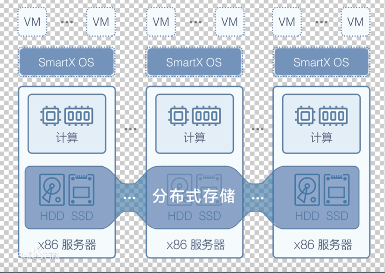 超融合技术架构主要组件有三大部分:计算虚拟化+网络虚拟化+存储虚拟化。超融合的特点之一就是,存储虚拟化基于分布式存储系统,融合了分布式缓存、SSD读写缓存加速、多副本机制等多种存储技术,在功能上与独立共享存储完全一致。分布式存储采用多副本机制,一份数据同时存储在多个不同的物理服务器硬盘上,提升数据可靠性,保障关键业务安全稳定运行。就是说,超融合架构会对数据做备份。一份数据会复制2-3份,存储在不同的服务器里。即使1台服务器坏了,数据也不会丢失,非常安全。