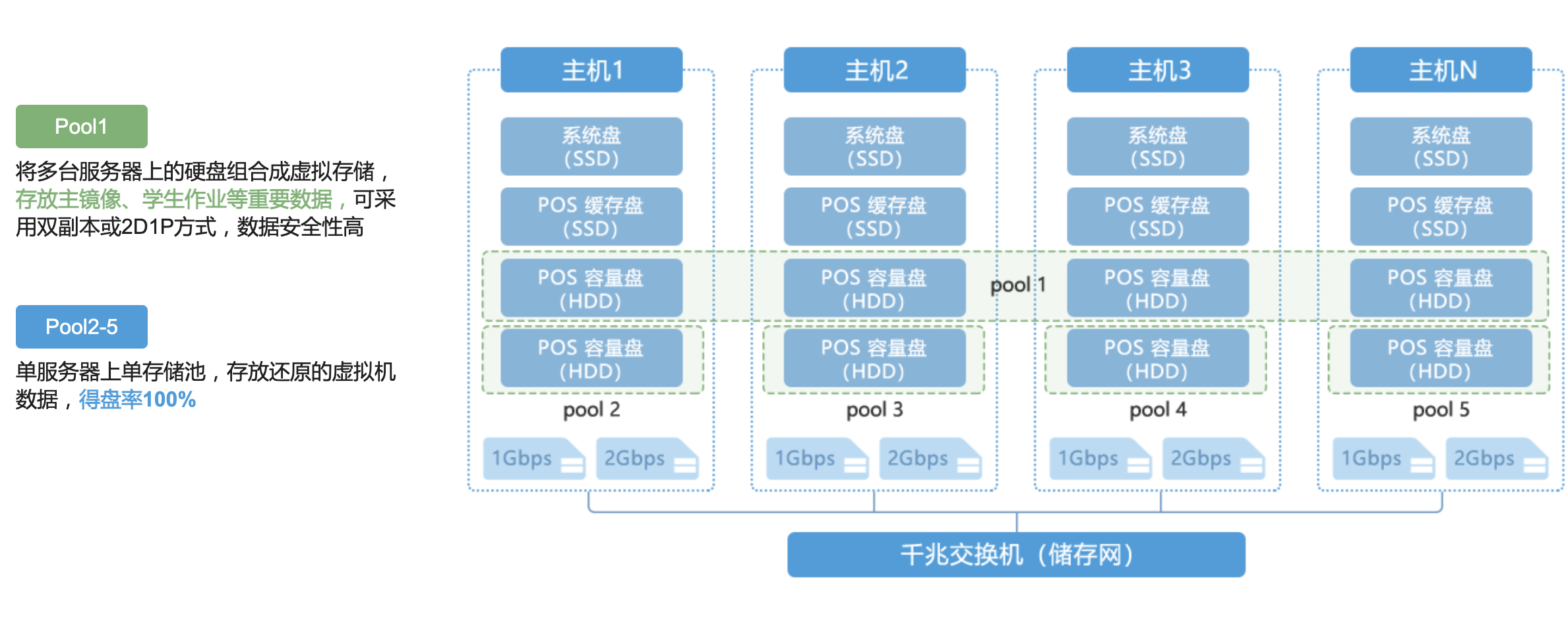 1、对安全要求高的数据,比如主镜像和学生作业等,可以采用多副本的方式,即在多台服务器上的存储池备份多份;还可以采用“纠删码”做数据安全保障,比传统超融合中的多副本存储方式占用更少的资源;